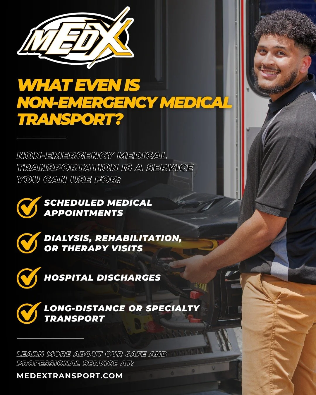 With a fleet of more than 100 fully powered, modern vehicles and advanced AI-enabled technology, we ensure safe, efficient, and data-driven care on every call. As the exclusive provider for major hospital systems, VA medical centers, and military facilities, MedEx continues to set the standard for trusted, responsive medical transport.